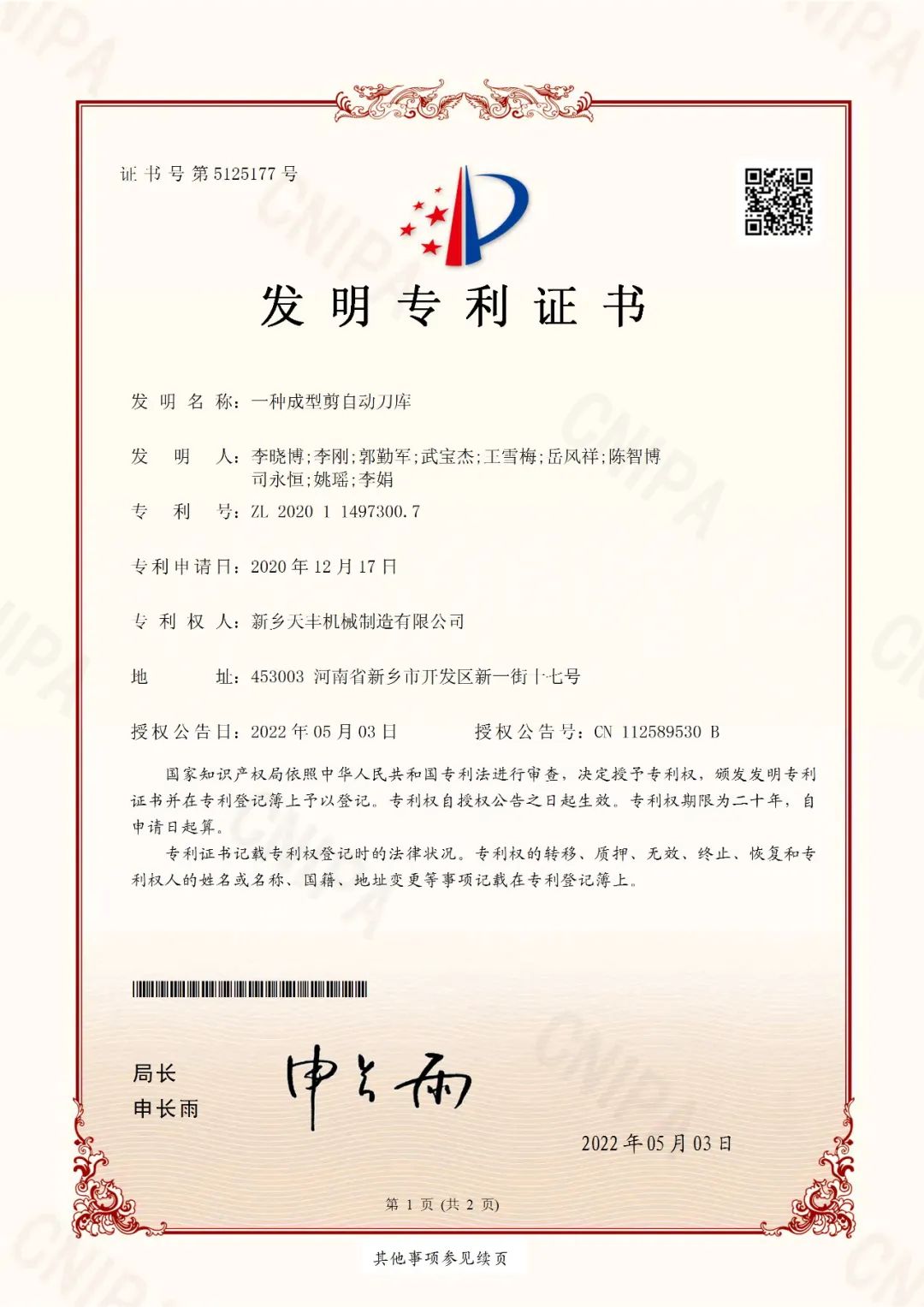 近日,天豐智裝(天豐機(jī)械公司)再獲一項(xiàng)國(guó)家自主知識(shí)產(chǎn)權(quán),進(jìn)一步增強(qiáng)了公司技術(shù)核心競(jìng)爭(zhēng)力,為創(chuàng)新驅(qū)動(dòng)發(fā)展再添新動(dòng)力。