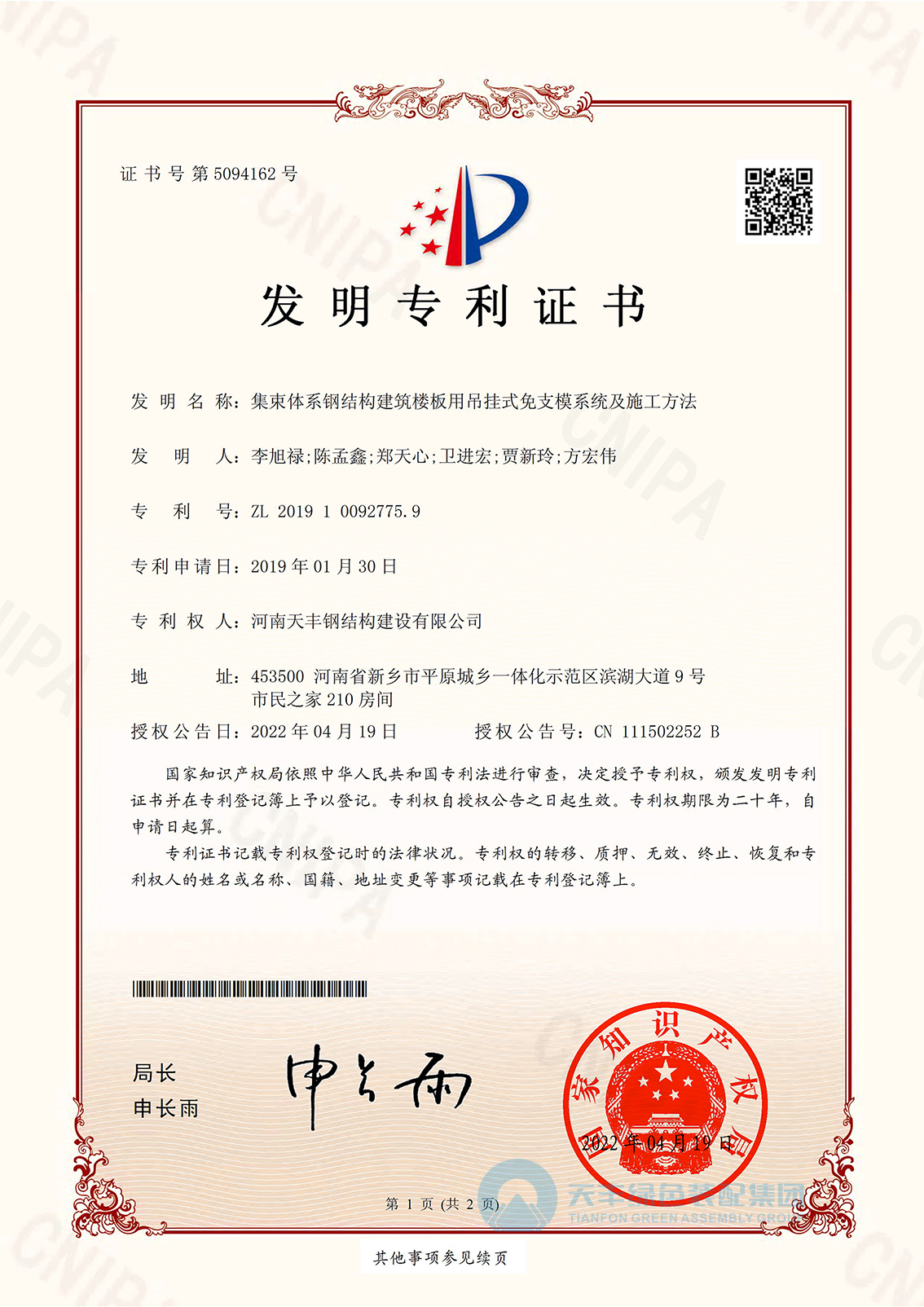 牛!天豐鋼結(jié)構(gòu)建設(shè)公司再獲國(guó)家自主知識(shí)產(chǎn)權(quán)